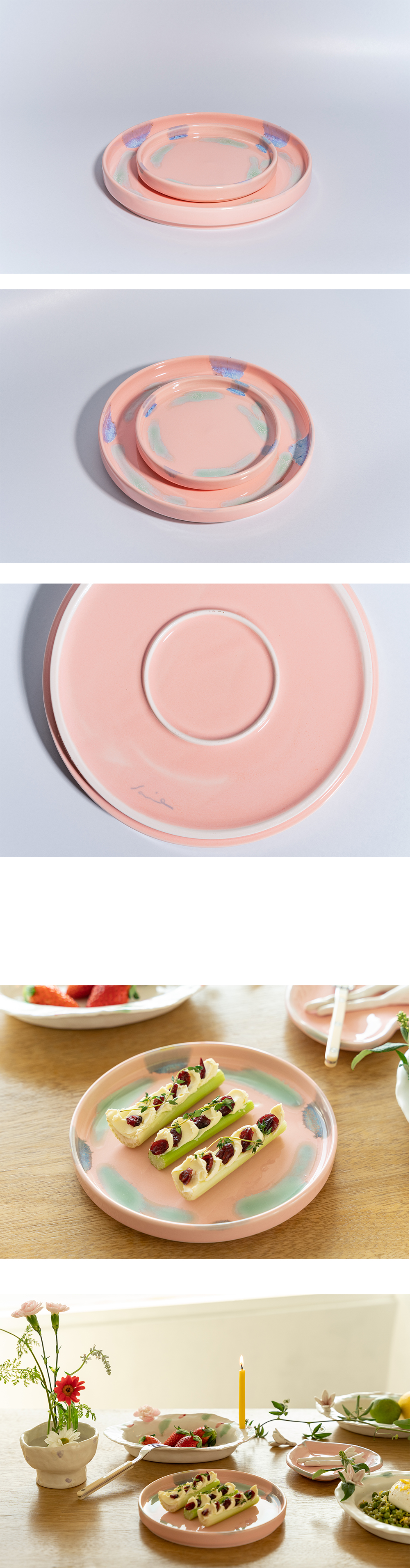 유광의 핑크빛 유약으로 바탕을 입힌 다음, 다른 종류의 유약을 레이어링해 표현되었습니다.