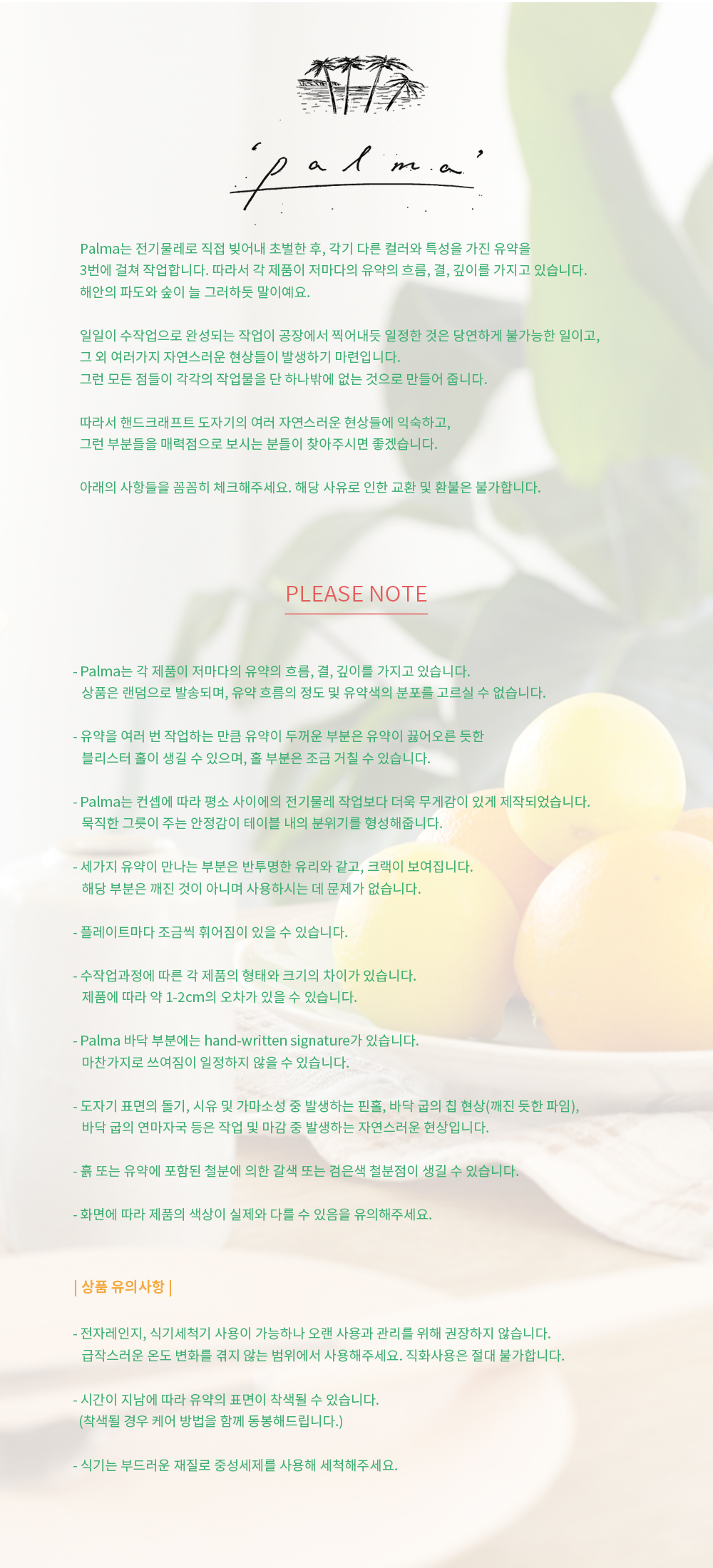 Palma는 처음부터 끝까지 수작업으로 완성되며, 2가지의 백자를 믹스해 만든 소지에 각기 다른 컬러와 특성을 가진 유약을 여러 번에 걸쳐 작업합니다. 각 제품이 저마다 다른 유약의 흐름, 결, 깊이를 가집니다. 해안의 파도와 숲이 늘 그러하듯 말이에요.